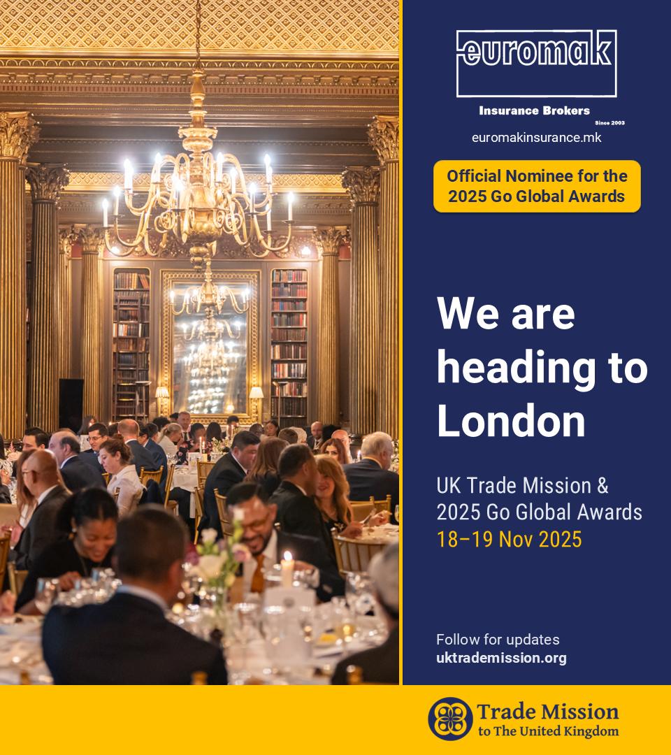 Осигурителната брокерска фирма „Еуромак Брокер“ АД, со задоволство го објавува својот избор за финалист во престижната категорија: Осигурителен брокер на годината на наградите „Го Глобал“ за 2025 година. Наградите, кои ги доделува Меѓународниот трговски совет, ја признаваат меѓународната извонредност во трговијата и иновациите – соопштија од фирмата.