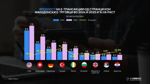 Странците лани потрошиле 52 милиони евра во македонските онлајн продавници или повеќе за 40,4% во споредба со 2024 година. 52,6% од вредноста на вкупно направените трансакции од странци кон македонски е-трговци лани ја направиле корисници на платежни картички од 9 земји, покажува анализата на Асоцијацијата за е-трговија на Македонија – АТЕМ во која се користени податоци на Народната банка. Вредноста која странските онлајн купувачи ја направиле кон домашните е-трговци е остварена во 2,3 милиони трансакции што е за 39,4% повеќе во однос на 2024 година.