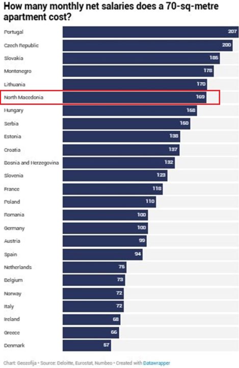 На спротивниот крај од спектарот е Португалија, каде што се потребни повеќе од 200 месечни нето плати – што ја става земјата на самиот врв на листата. Ова откритие се совпаѓа со фактот дека, во јуни оваа година, Европската комисија ја предупреди португалската влада дека мерките што се спроведени досега не биле ефикасни во справувањето со кризата со домувањето.