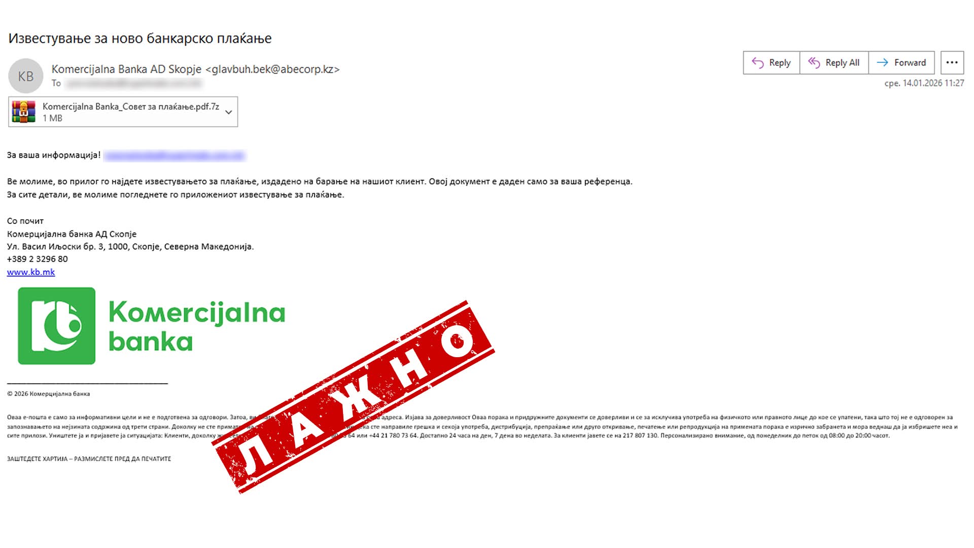 Според банката испраќачот лажно се претставува во име на Комерцијална банка, известува за плаќање и испраќа фајл кој содржи вирус.