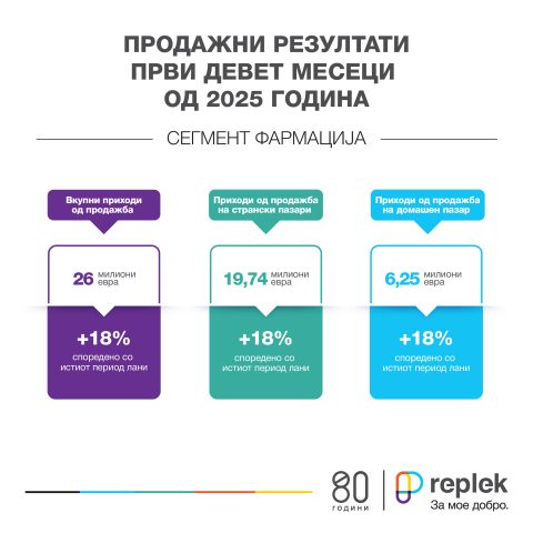 Првите девет месеци од годинава „Реплек“ ги заврши со силен раст на приходите во сегментот Фармација од 18 % во однос на истиот период од минатата година. Компанијата континуирано инвестира во модернизација, дигитализација и проширување на пазарите, а во изминатиов период високите производни стандарди беа потврдени и со добивање на два EAEU GMP сертификати кои креираат дополнителни можности за проширување на пласманот на производите на 183- милионскиот пазар на Евроазиската економска унија.
