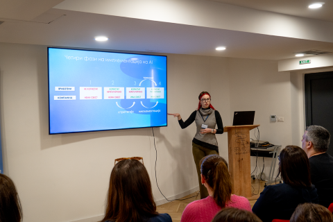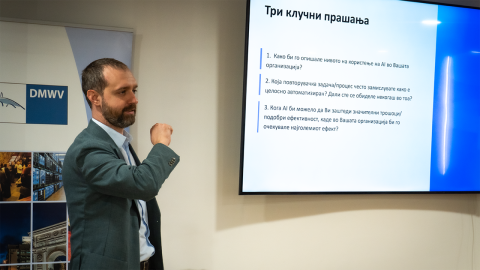Своите искуства и знаења со учесниците ги споделија Елена Димовска, раководител на секторот за анализа на податоци и АI во Семос Едукација, која се осврна на техничките предуслови и организациската подготвеност за AI имплементација, Кристина Тасева, специјалист за AI имплементација, која презентираше конкретни насоки за проценка и поддршка на компаниите при имплементација на AI, како и Дане Тодоровски, тренер и бизнис консултант, кој ја истакна деловната перспектива и ефектите што компаниите можат да ги постигнат преку правилна и стратешка примена на вештачката интелигенција.