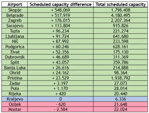 Скопскиот аеродором планира до 28 март да опслужи околу 548.000 патници повеќе од лани, а белградскиот 518.000. На аеродромот во Охрид, пак, се очекува зголемување од 24.000 патници, објави специјализираниот портал „Ex-Yu aviation“. Речиси сите аеродроми во поранешна Југославија го зголемуваат својот расположлив капацитет во споредба со минатата година.