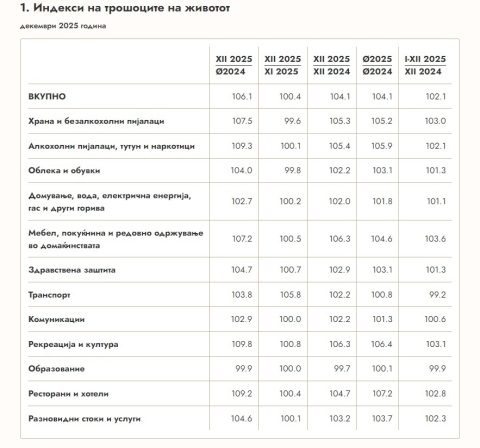 Во декември лани, во однос на претходниот месец, намалување на трошоците на животот е забележано кај храна и безалкохолни пијалаци за 0,4 проценти и облека и обувки за 0,2 отсто. ДЗС известува дека трошоците на живот во групите образование и комуникации остануваат на исто ниво како и во претходниот месец, без промени.