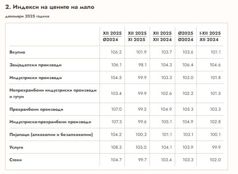 ДЗС објави и дека индексот на цените на мало во декември бележи зголемување од 1,9 отсто во однос на претходниот месец, а на годишно ниво индексот на цените на мало бележи раст од 3,7 проценти. На годишно ниво, пак, кај цените на мало најголемо зголемување има кај индустриско-прехранбените производи за 5,1 отсто и прехранбените за 4,9 проценти.