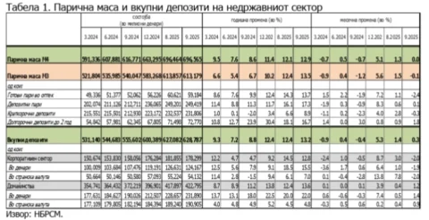 Паричната маса месечно благо се намали за 0,1 процент, поради пад на готовите пари во оптек и краткорочните депозити, и покрај растот на долгорочните депозити и депозитните пари. На годишна основа, растот од 13,5 проценти е поттикнат главно од депозитните пари и краткорочните депозити. Вкупните депозити во септември се зголемени за 0,3 проценти месечно, доминантно под влијание на домаќинствата, додека корпоративниот сектор бележи пад – типичен образец во периоди кога фирмите затвораат обврски кон крај на кварталот и ја оптимизираат ликвидноста.
