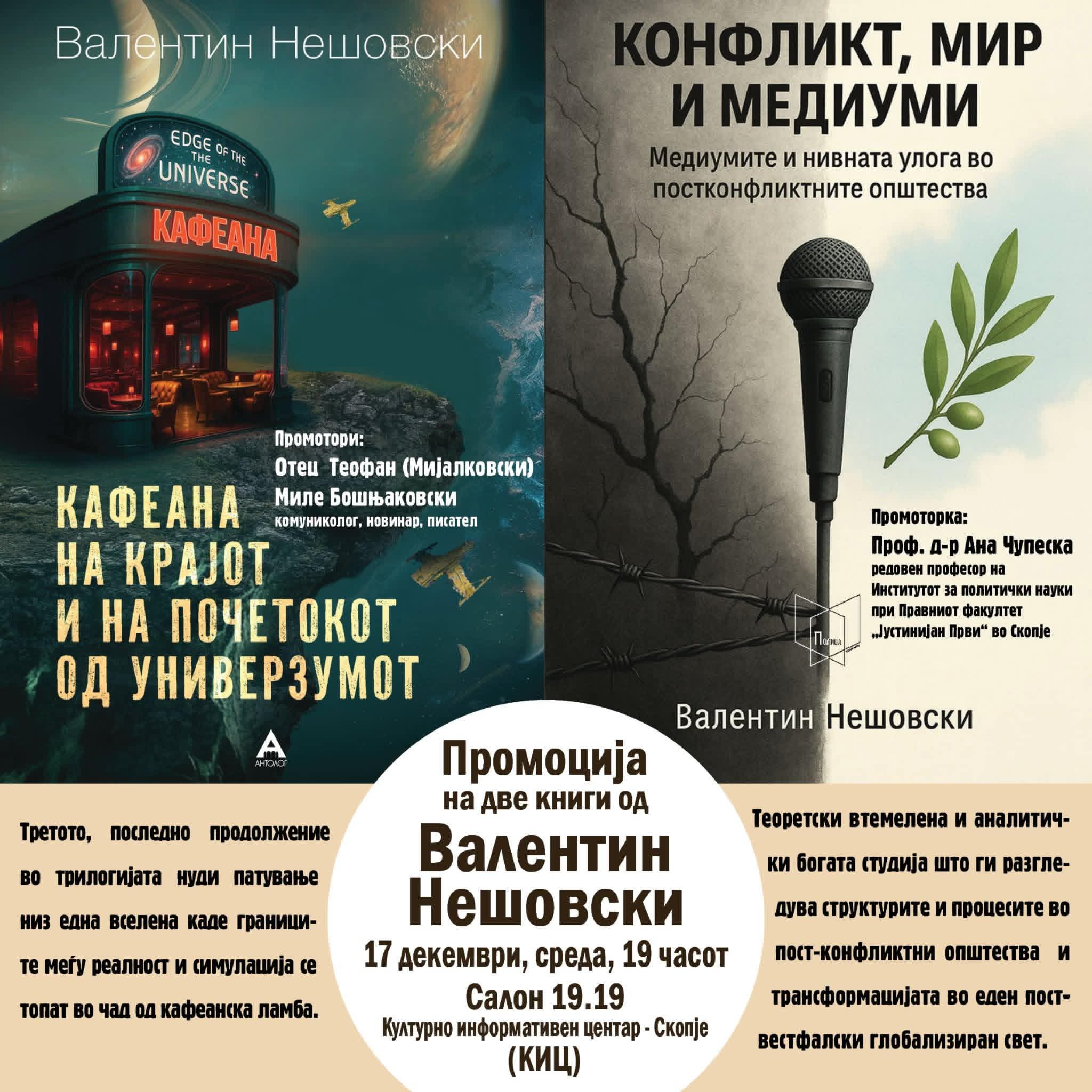 ,,Знам, веројатно ќе помислите претерува, но ве поканувам сите на промоција на нови две книги од мене. Едната е последната во трилогијата научна фантастика, во издание на Антолог, другата во издание на Полица, стручна, пишувана далечната 2004, но никогаш објавена. Посветена е на мојата ќерка Ана, која ја сакаше и безброј пати ја препрочитуваше. Ве очекувам идната среда во салон 19.19 во 19 часот”, објави Нешовски кој преходно објави повеќе книги.