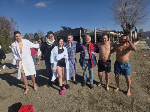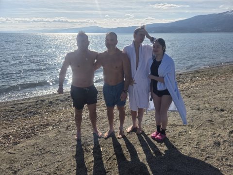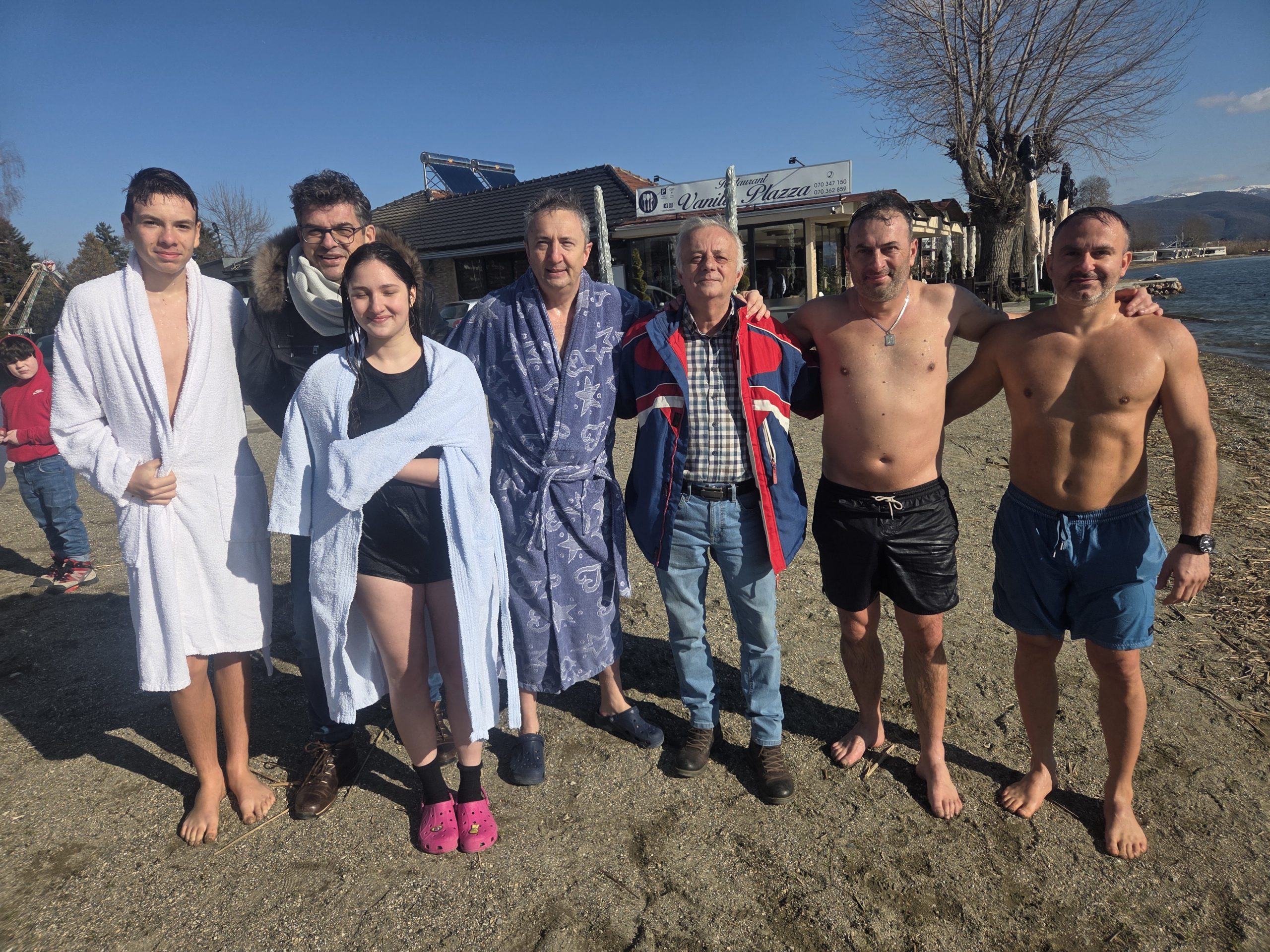 Познатиот Стружанец, професор на Факултетот за туризам во Охрид, водечки светски експерт за осигурување Климе Попоски и годинава со својата тајфа на Водици. Богојавление, традиционално влезе во студената вода во Струга.