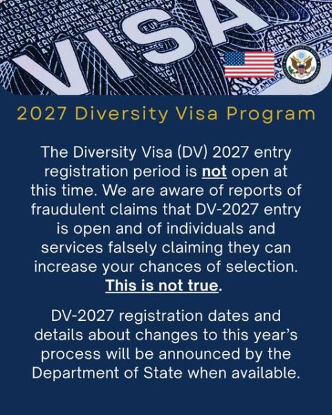 ,,Периодот за регистрација за Виза за разновидност (DV) 2027 во моментов не е отворен. Свесни сме за извештаи за лажни тврдења дека пријавувањето за DV-2027 е отворено и за поединци и служби кои лажно тврдат дека можат да ги зголемат вашите шанси за избор. Ова не е вистина”, објавуваат од амбасадата на САД.