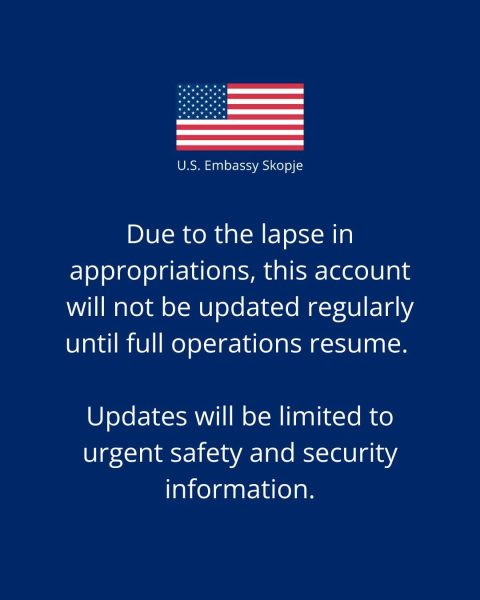 ,,Поради прекин на асигнации, оваа сметка нема редовно да се ажурира додека целосните операции не се продолжат. Ажурирањата ќе бидат ограничени на итни информации за безбедност”, стои во објавата на профилот на Фејсбук на американската амбасас во Македонија.