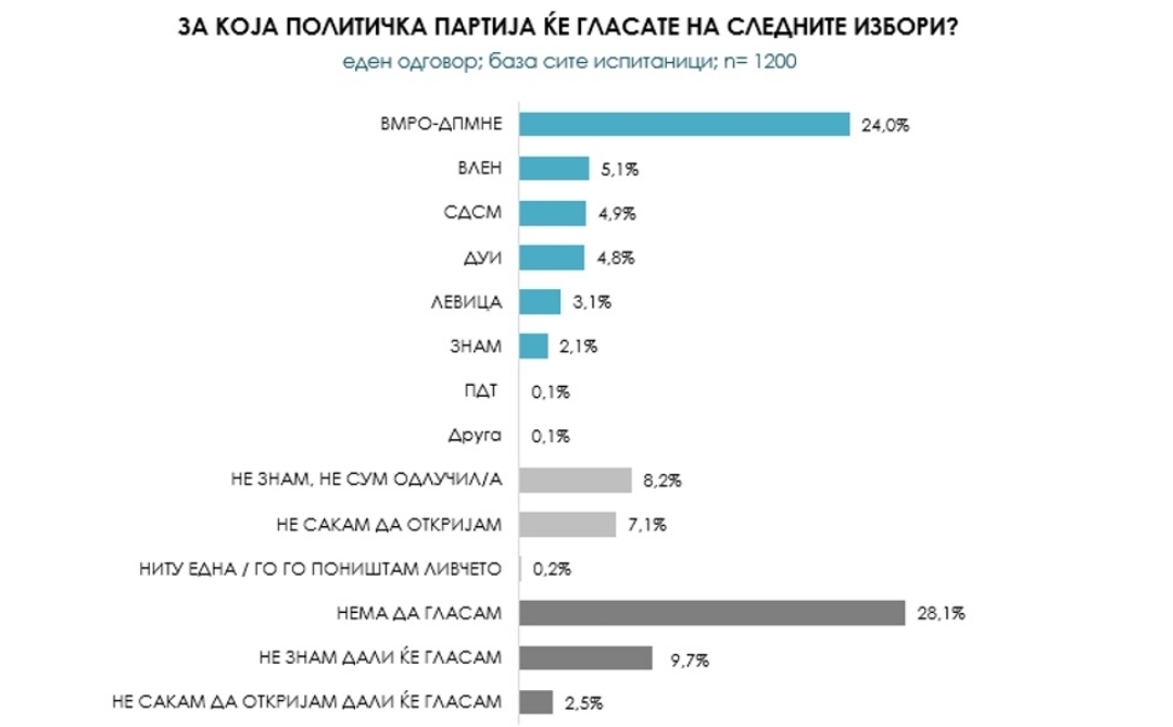 24 отсто од испитаниците, на прашањето за која политичка партија ќе гласате на следните избори, одговориле дека нивниот избор е ВМРО-ДПМНЕ.