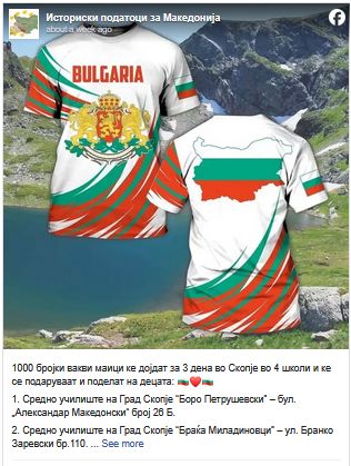 Фејсбук страницата „Историски податоци за Македонија“ најавува дека ќе се делат маици „Бугарија“ во училишта низ Скопје.