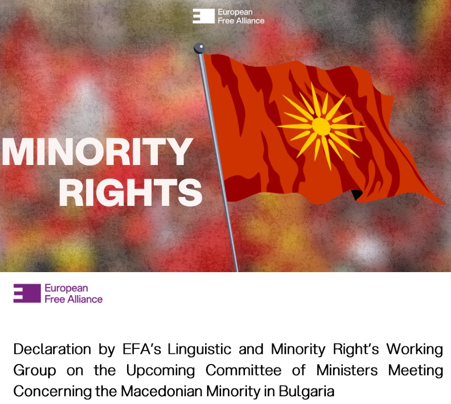 „Работната група за јазични и малцински права на Европската слободна алијанса (ЕФА) изразува сериозна загриженост во врска со одлуката да се разгледа барањето на бугарската влада за затворање на мониторингот на групата Обединета Македонска Организација Илинден и други против Бугарија (Апликација бр. 59491/00) на претстојниот состанок на Комитетот на министри на Советот на Европа на 2 декември 2025 година.“