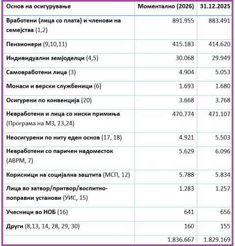 Во моментов во Македонија има 1.836.667 осигуреници, од кои 470.774 осигуреници или секој четврти (25%) се лица кои не остваруваат приходи, a за кои осигурувањето го покрива државата, соопшти Фондот за здравствено осигурување (ФЗО) кој денеска објави најнови податоци за бројот на осигуреници во земјава.