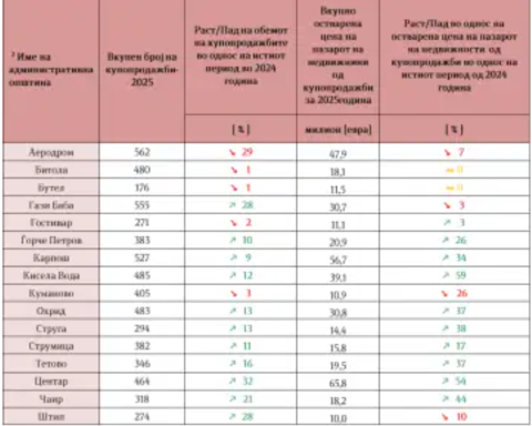 Најмногу купопродажби во првото шестмесечје од 2025 година се направен во Аеродром – 562, Гази Баба – 555 и Карпош – 527 купопродажби, а најмалку во Бутел, 176 купопродажби. Највисока вкупна вредност на остварена цена од направените купопродажби за овој период постигната е во Центар, 65,8 милиони евра, Карпош, 56,7 милиони евра, Аеродром, 47,9 милиони евра, а најниска во Штип, 10,0 милиони евра.