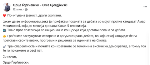 „Сакам да ве информирам дека ја прифаќам поканата за дебата со мојот противкандидат Амар Мециновиќ, која до мене ја достави Канал 5 телевизија. Тоа е прва телевизија со национална концесија која достави покана за дебата“, објави кандидатот за градоначалник на Скопје Орце Ѓорѓиевски.
