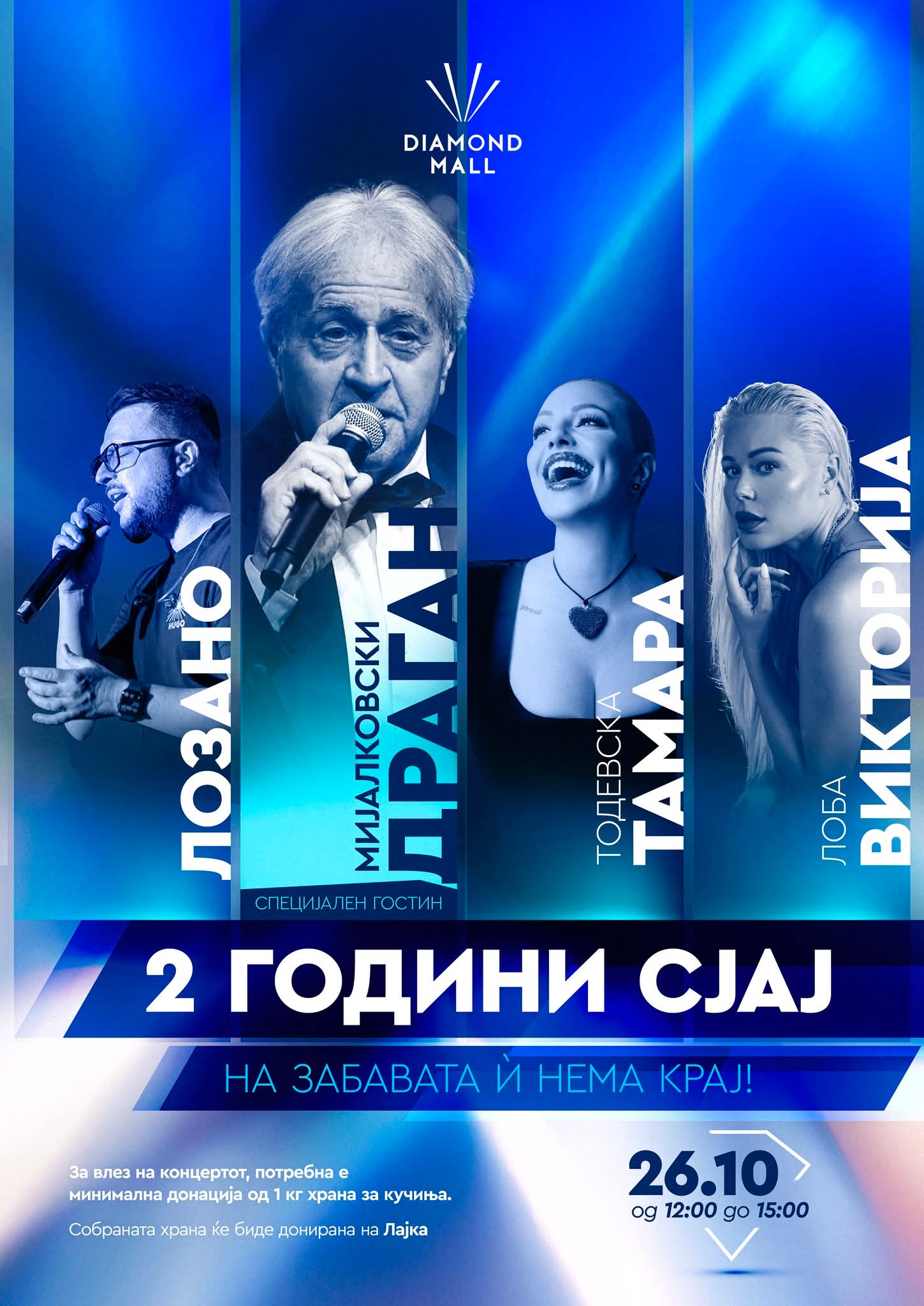 Влезот ќе биде бесплатен, а единствен услов, во духот на целиот настан, ќе биде да се донесе минимум еден килограм храна за кучиња, која потоа ќе ѝ биде донирана на „Лајка“, која е партнер на Diamond Mall во реализација на овој хуманитарен настан. Во 14.00 часот ќе бидат објавени добитниците од роденденската наградна игра, по што концертот продолжува. За потсетување, големата роденденска наградна игра трае до 26 октомври, а главната награда е најновиот модел на автомобил Geely Cityray, како и повеќе парични награди, меѓу кои и две од по 50.000 денари. За учество е потребен купон, кој се добива за секое купување на производи и услуги од Diamond Mall во вредност од 1.000 денари. Инаку, модната понуда на Diamond Mall ќе биде збогатена и со новиот бренд Funky Buddha, кој ќе биде вистинско изненадување за сите љубители на урбаниот стил, а во финална фаза се и подготовките за отворањето на најголемиот фитнес центар. Diamond Mall официјално беше отворен на 20 октомври 2023 година и со својот уникатен концепт на Лајф-центар стана едно од омилените места за шопинг, дружење и забава.