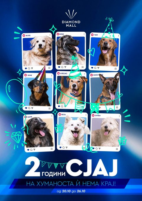 Diamond Mall ја започна својата роденденска прослава со повик до граѓаните на заедничка хумана мисија, посветена на грижа за напуштените животни и поттикнување на нивно вдомување. Наместо класична прослава, Diamond Mall преку низа активности сака да ја подигне свесноста за грижата за бездомните животни и да ги поттикне граѓаните повеќе да вдомуваат улични кучиња. Роденденските активности стартуваат на 20 октомври, кога во трговскиот центар ќе биде отворена Зона за донации, каде посетителите, сѐ до 25 октомври, ќе можат да остават храна и опрема за миленици, кои потоа ќе му бидат донирани на Јавното претпријатие „Лајка“. Oд 24 до 26 октомври ќе се одржи Саем за храна за миленици, на кој ќе учествуваат компании од оваа индустрија, а ќе нудат совети за правилна грижа за животните.