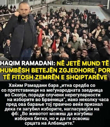 Како што јавуваат информативните агенции на албански јазик, само неколку часа пред да објави дека им упатил такво барање до претставниците на меѓународната заедница, Хаќим Рамадани имал напишано, исто така, на својот фејсбук-профил: „Иако ја загубивме трката, не се чувствувам како губитник. Ако некој е вознемирен вечерва, тоа сум јас. Сите треба да се чувствуваме горди, бидејќи покажавме љубов, храброст и единство за нашата татковина.“ Се наметнува дилемата: кон која татковина порачува Рамадани дека „покажале љубов, храброст и единство“, дали кон Република Македонија, во која што живее и работи сѐ уште како директор на Државниот инспекторат за локална самоуправа? Или можеби неговата објава се однесува на „некоја друга татковина“?