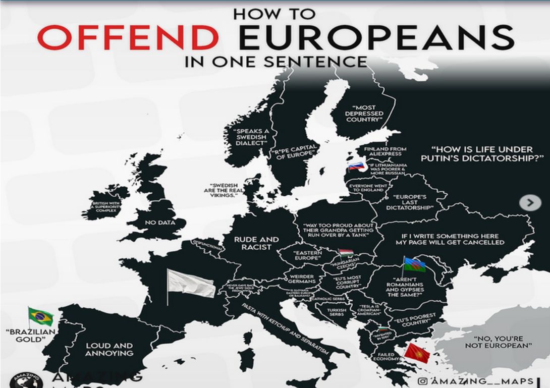 Инстаграм-страницата „Амејзинг мапс“ објави карта насловена „Како да ги навредите Европејците во една реченица“, според која најголемата навреда во Македонија или стереотип што најмногу боли е „измислени во 1991 година“, произлезени, очигледно, од оспорувањето на македонскиот идентитет од соседите Грција и Бугарија.