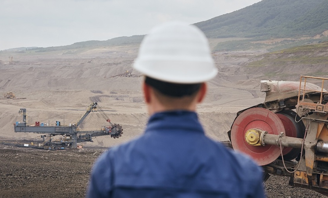 Coal mining in surface mine. Miner looking on the huge excavator.
