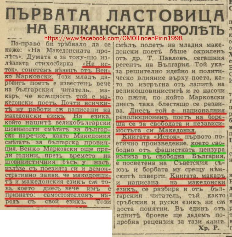 Партијата на Македонците во Бугарија објавува напис од 📰 број 32, од весникот “Работническо Дело” од 24 октомври 1944 година кој всушност е