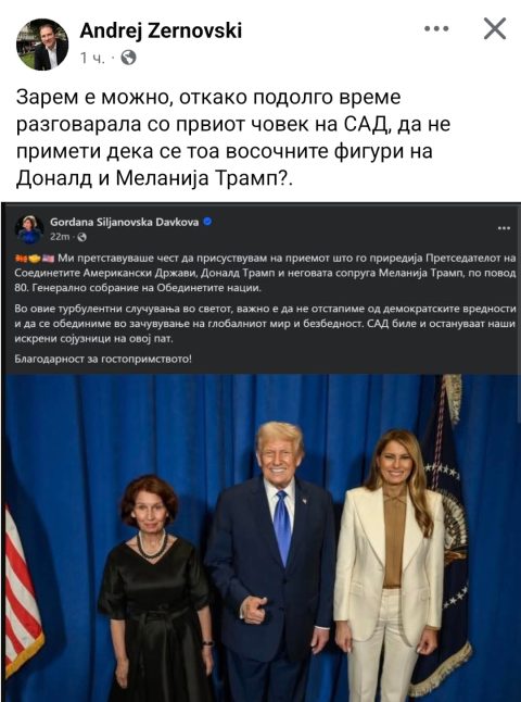 Без никаква проверка Жерновски кој за себе тврди дека е сериозен политичар и дипломат во обид да ја навреди објавил дека претседателката Гордана Сиљановска Давкова подолго време разговарала со Доналд Трамп и не забележала дека тој е восочна фигура.