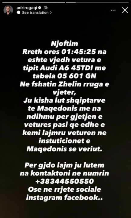 Пејачот на Инстаграм оставил податоци за кражбата на возилото и телефонски број за контакт на албански јазик доколку некој ја знае локацијата на возилото Ауди 6.