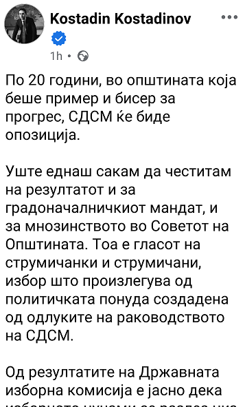Aктуелниот градоначалник на Струмица, Костадин Костадинов по изборниот дебакл на СДСМ во Струмица на Фејсбук објави дека по 20 години, во општината која беше пример и бисер за прогрес, СДСМ ќе биде опозиција.