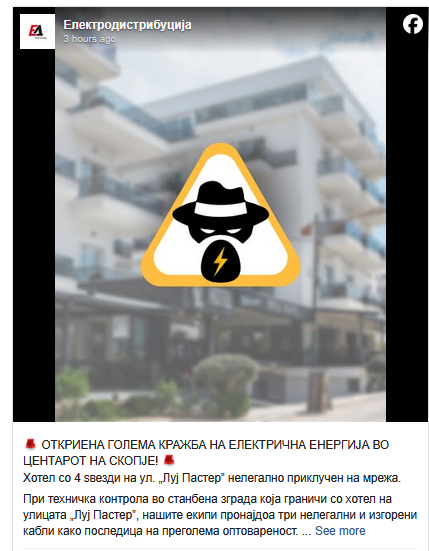 „За време на дополнителната контрола, нашите екипи утврдија дека хотелот повторно бил приклучен на еден од нелегалните кабли. Овој чин не само што претставува кражба на електрична енергија, туку создава и огромна опасност за животите и имотот на граѓаните“, објавија од Електродистрибуција на својата официјална страница на социјалните мрежи.