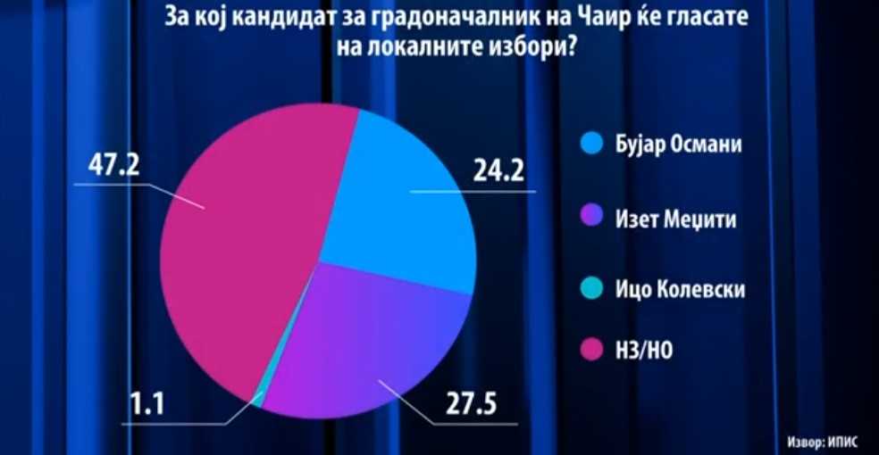 Резултатите покажаа дека 27,5% од граѓаните на Чаир имаат најголема доверба во Меџити и на изборите ќе гласаат за него. За Бујар Османи од ДУИ се изјасниле дека ќе гласаат 24,2% од испитаниците.