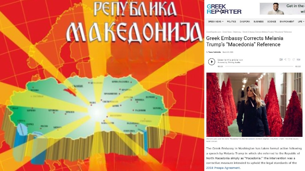 Овој портал објави: „Грчката амбасада во Вашингтон презеде формални мерки по говорот на Меланија Трамп во кој таа ја нарече Република Северна Македонија едноставно „Македонија“. Интервенцијата беше корективна мерка наменета да ги почитува правните стандарди од Преспанскиот договор од 2018 година. За време на нејзините говори на еден настан со висок профил претходно оваа недела, првата дама го употреби името „Македонија“ за да го опише северниот сосед на Грција. Бидејќи терминот „Македонија“ се однесува исклучиво на историската и географската грчка провинција, неговата употреба како име за странска држава е чувствително дипломатско прекршување. Според принципот erga omnes на Преспанскиот договор, соседот мора да се нарекува „Северна Македонија“ во сите официјални и јавни контексти.“