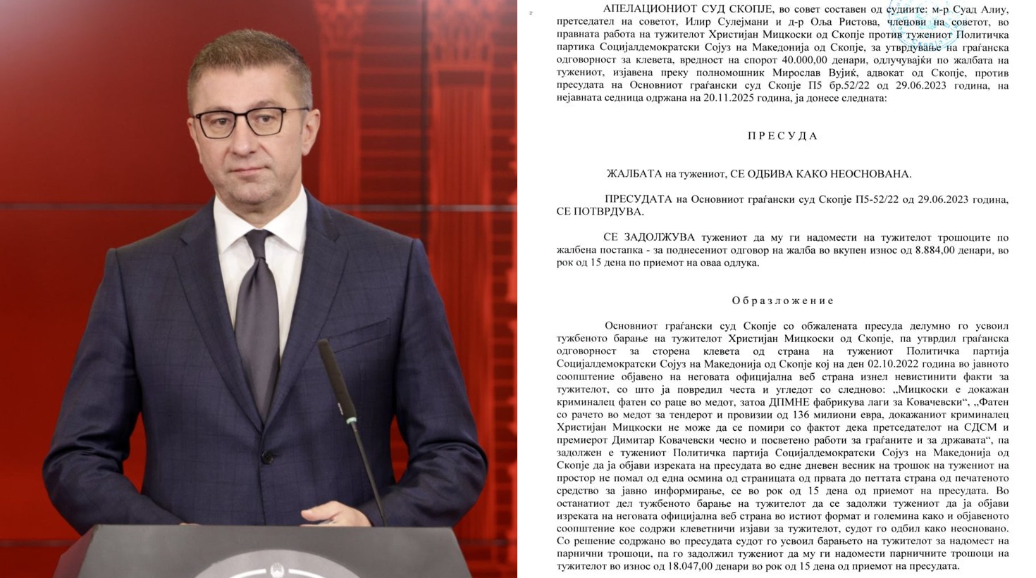 Премиерот Христијан Мицкоски денес објави на социјалните мрежи дека Апелациониот суд Скопје донел правосилна пресуда (ГЖ-1778/24 од 20.11.2025) со која се утврдува дека СДСМ изнесувала невистини и тешки клевети против него, без докази и основа.