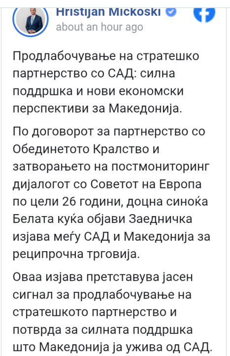 „Оваа изјава претставува јасен сигнал за продлабочување на стратешкото партнерство и потврда за силната поддршка што Македонија ја ужива од САД. Таа го трасира патот кон сеопфатен договор, кој ќе обезбеди тарифи не повисоки од 15 %, а за одредени производи и индустрии и до 0 %, отворајќи нови можности за извоз, инвестиции и економски раст.