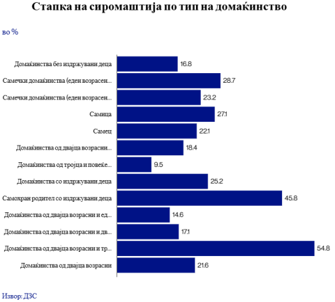 Просечно секој петти граѓанин во државата живее во сиромаштија, а според последните податоци на ДЗС за лани, стапката на сиромаштија во земјата изнесува 21,9 %. Најизразена е кај децата до 17 години каде процентуалноста пак достигнува 29,5 % што укажува на тоа дека речиси една третина од младите деца живеат во сиромаштија. Кај вработените лица, стапката на сиромаштија во 2024 година изнесува 7,9 проценти, што укажува на присуство на т.н феномен на „сиромашни вработени“ – лица кои и покрај тоа што имаат работа, остваруваат приходи под прагот на сиромаштија.