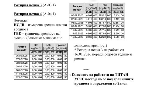 Паралелното мерење на амбиенталниот воздух (PM10 честички) во кругот на ТИТАН УСЈЕ не покажува меѓузависност со состојбите со амбиенталниот воздух измерени на други мерни станици, надвор од цементарницата.