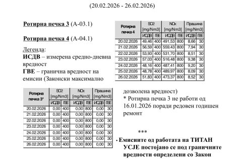 Паралелното мерење на амбиенталниот воздух (PM10 честички) во кругот на ТИТАН УСЈЕ не покажува меѓузависност со состојбите со амбиенталниот воздух измерени на други мерни станици, надвор од цементарницата.