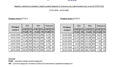 ТИТАН УСЈЕ редовно објавува неделен преглед на средно-дневните мерења на емисиите од главните емисиони точки на Цементарницата