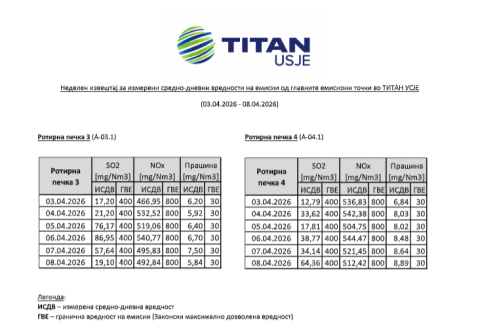 Неделен извештај за измерени средно-дневни вредности на емисии од главните емисиони точки во ТИТАН УСЈЕ