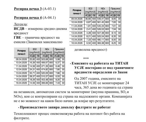 Паралелното мерење на амбиенталниот воздух (PM10 честички) во кругот на ТИТАН УСЈЕ не покажува меѓузависност со состојбите со амбиенталниот воздух измерени на други мерни станици, надвор од цементарницата.