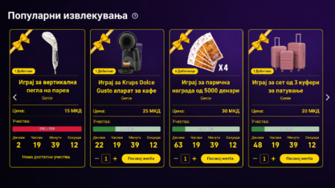 И тоа е сè. Секое учество претставува шанса да се освои посакуваната награда особено поради фактот дека бројот на учества за секоја награда е ограничен, а секој корисник може да купи повеќе учества за да ги зголеми своите шанси.