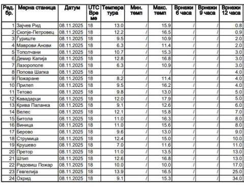 На табелата можете да ги видите измерените температури вечерва до 19 часот по градови и места во нашата Македонија како и наврнатото количество на воден талог во литри на метар квадратен во изминатите 12 часа исто така до 19 часот вечерва и тоа на мерните станици на УХМР.