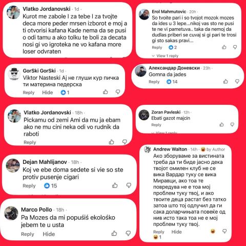 Одвратен говор на омраза се случува ма социјалните мрежи кон готвачот Виктор Настески кој што укажа дека во угостителски објекти каде што нема физичко одвојување на пушачите и непушачите а се јаде и пие, не смее да се пуши.