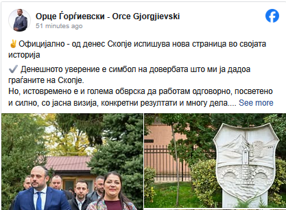 Денешното уверение е симбол на довербата што ми ја дадоа граѓаните на Скопје, објави на социјалните мрежи новоизбраниот градоначалник на Скопје Орце Ѓорѓиевски