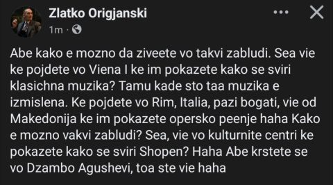 „А бе како е можно да живеете во такви заблуди? Сеа, вие ќе појдете во Виена и ќе им покажете како се свири класична музика? Таму кадешто таа музика е измислена. Ќе појдете во Рим, Италија, пази богати, вие од Македонија ќе им покажете оперско пеење хаха. Како е можно вакви заблуди? Сеа, вие во културните центри ќе покажете како се свири Шопен? Хаха. А бе крстете се во Џамбо Агушеви, тоа сте вие, хаха“, коментира на Фејсбук фронтменот на некогашната македонска група „Анастасија“ и еден од најгласните поддржувачи на политиките на експремиерот Зоран Заев, чија Влада го постави за директор на МКИЦ во Тирана.