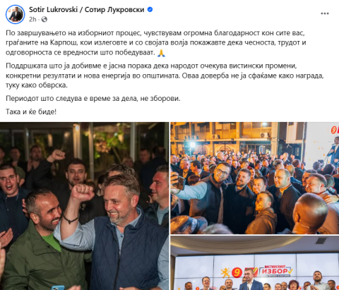 По завршувањето на изборниот процес, чувствувам огромна благодарност кон сите вас, граѓаните на Карпош, кои излеговте и со својата волја покажавте дека чесноста, трудот и одговорноста се вредности што победуваат, порача новиот градоначалник на Карпош, Сотир Лукровски.