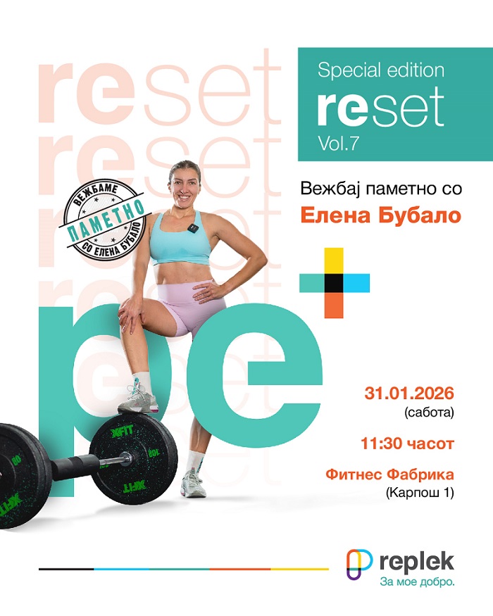 Во рамките на РЕсет платформата за добросостојба на „Реплек“, под мотото „За мое добро“, ќе се организира уште еден настан посветен на постигнување на добросостојба преку физичка активност. Првиот РЕсет настан во 2026 година добива едукативен карактер и означува уште една година исполнета со енергија и грижа за добросостојбата на заедницата. Наместо класична фитнес сесија, познатата инструкторка Елена Бубало ќе сподели корисни насоки и препораки за паметен пристап кон вежбањето, со фокус на техника, безбедност и свесно движење. Ова седмо издание на настанот, насловено како „Special edition – Вежбај паметно“, ќе се одржи на 31 јануари 2026 (сабота), во 11.30 часот, во салата за вежбање „Фитнес Фабрика“, лоцирана на ул. „Драган Ѓаконовски Шпато“ бр. 18, во скопската населба Карпош 1.
