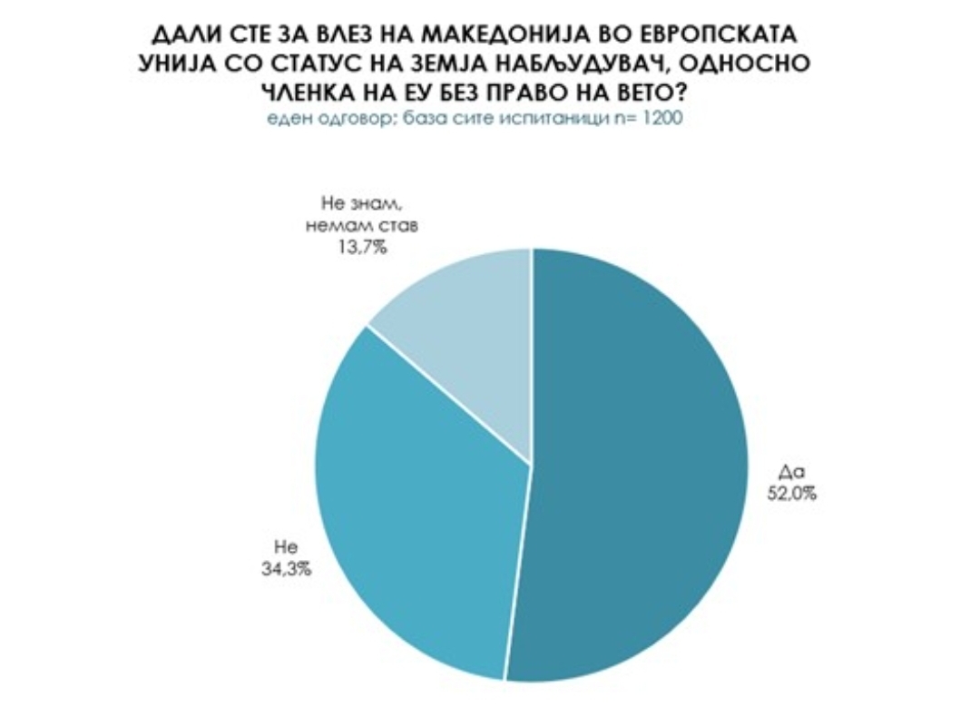 Повеќе од половина (52%) од испитаниците изјавиле дека се за влез на Македонија во ЕУ без право на вето.