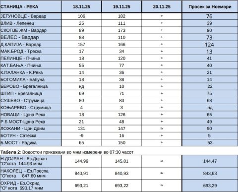Обилните дождови во текот на изминатиот период предизвикаа нагло покачување на водостоите на речиси сите поголеми реки низ Македонија, соопшти Управата за хидрометеоролошки работи. Најсилен пораст е забележан на горниот тек на Вардар, на Пчиња, Лепенец, Пена, Радика, Треска, Црна и Сатеска, а водостојот продолжува да расте и во Скопје.