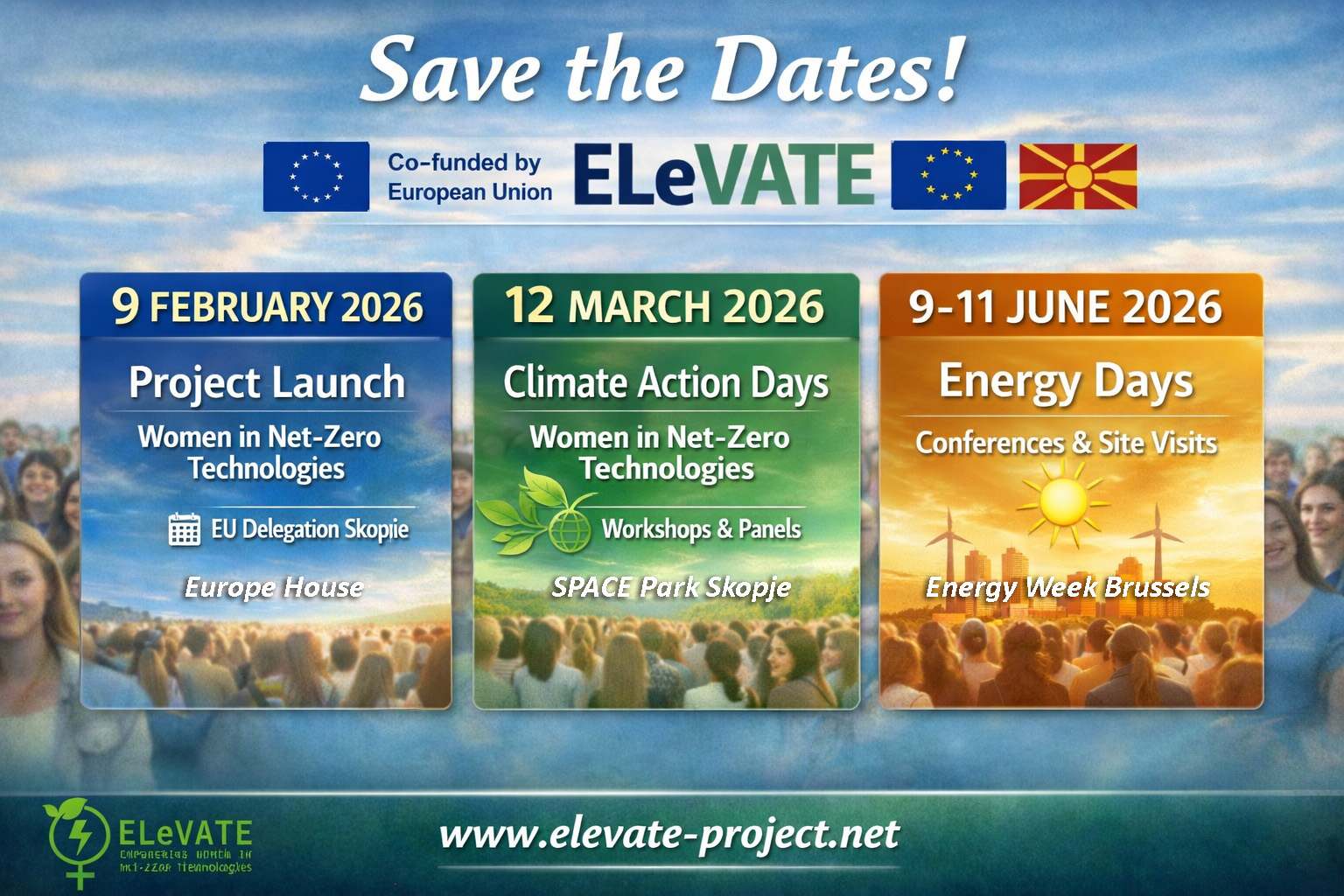 На 9 февруари 2026 година во Europe House во Скопје ќе се одржи официјалниот настан на кој ќе се промовира проектот ELeVATE – Women in Net-Zero Technologies (Smart Electricity for Buildings – SEB), иницијатива насочена кон поттикнување на учеството на жените во одржливи енергетски и паметни технолошки решенија за објекти.